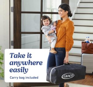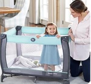 This bed-and-play unit opens with one push and folds with one pull. It stays steady on the floor, is easy to carry, and comes with a thick mattress. It’s suitable from newborn to age three and works as a bed or a small play space. Material: metal, plastic, fabric, polyester. Weight: 9.12 kg. Size: 41.5 x 30.2 x 30 inches.